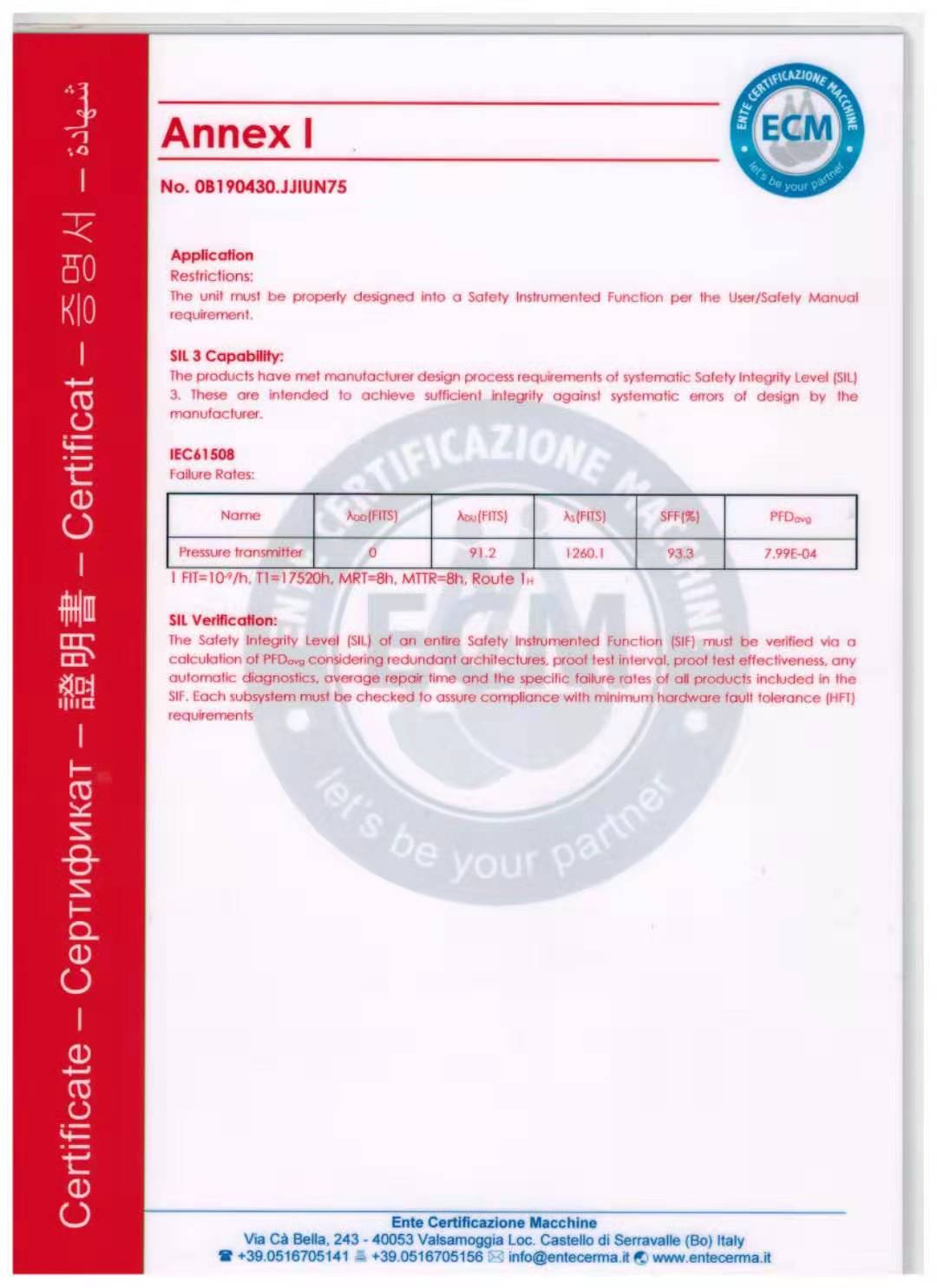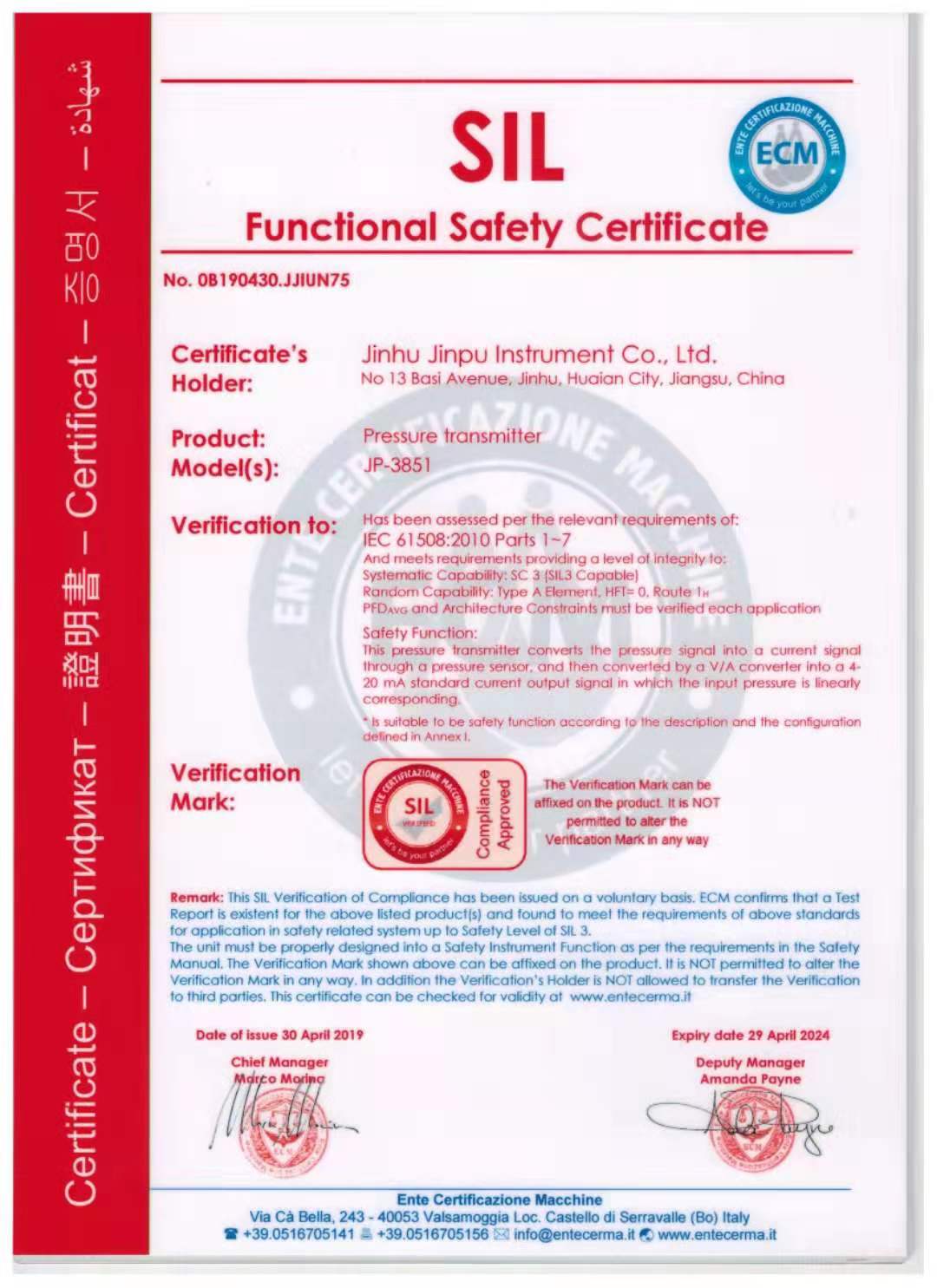 以下圖片為金湖金普儀表獲得的SIL2認證,該證書證明了變送器質量優秀,獲得廣大用戶認可。