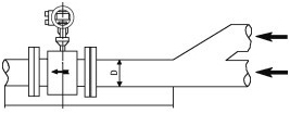 | 7.支管進(jìn)總管 對(duì)于流量計(jì)前端有兩個(gè)支管進(jìn)總管時(shí),應(yīng)保證流量計(jì)的前直管段≥30D,后直管段≥3D | ![]() | |||||||||||||||||||