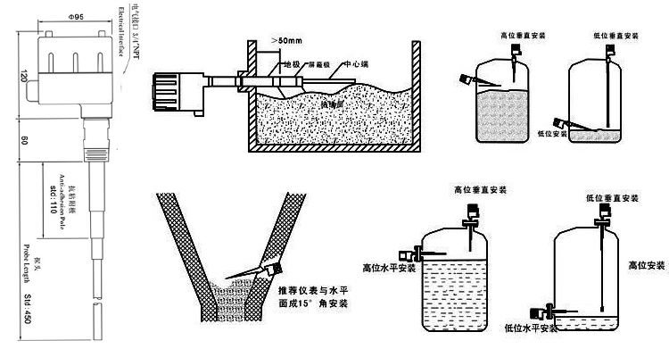 四、射頻導納物位開關外形尺寸圖及安裝示意圖: