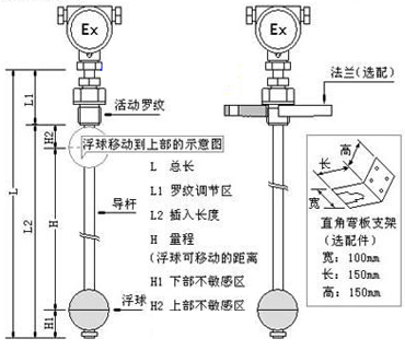 三、浮球液位計外形尺寸圖及安裝示意圖: