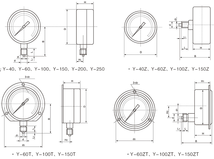 Y-40/60/100/150/250T系列軸向帶邊壓力表